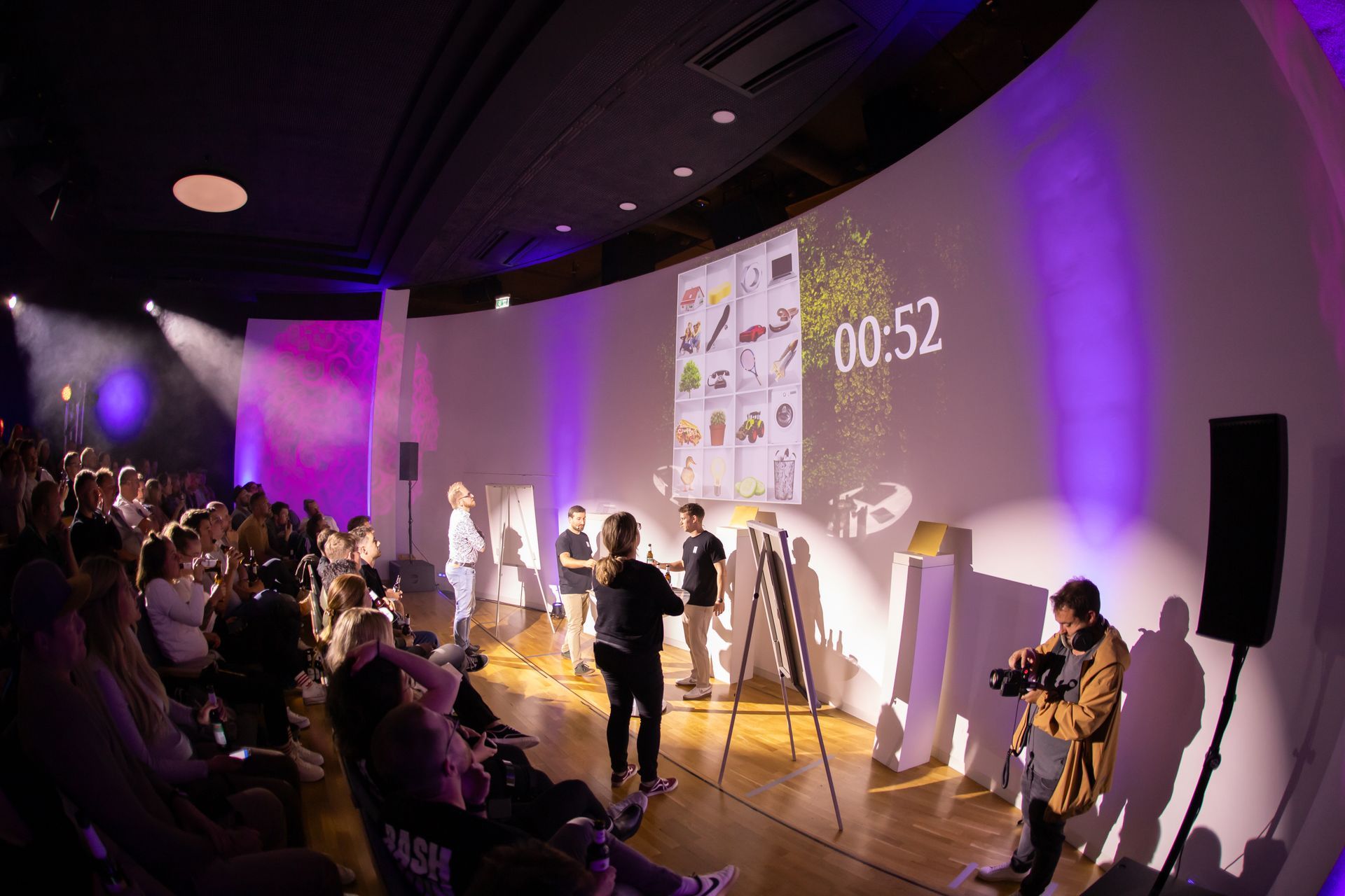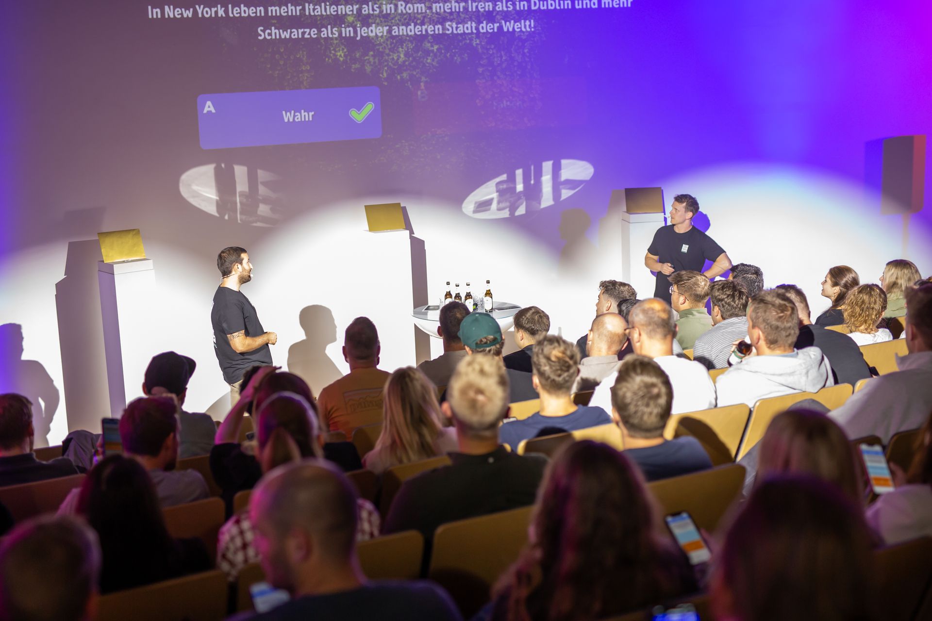Bei der BASH BOOM BANG Quizshow bist du selbst aktiver Part einer Show, wie du sie sonst nur aus dem Fernsehen kennst. Ein Moderatorenteam führt durch die Show und entertaint eure Gäste. Jeder Mitspieler wird aktiv gefordert – ob im Quiz oder bei spannenden Minigames auf der Bühne. Antworten gibst du bequem über das Smartphone oder einen Buzzer, sodass alle im Spiel bleiben und mitfiebern können. Das sorgt für Energie und Spaß – perfekt, um den Teamgeist zu stärken. Ganz egal ob 50 oder 500 Teilnehmer, wir setzen eure Wünsche maximal flexibel um. Wenn du Lust auf ein interaktives Event hast, das alle fordert, dann lass uns jetzt eine Anfrage zukommen.